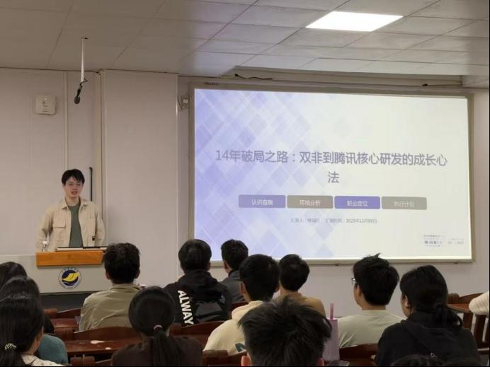 互动环节,同学们就技术学习、科研方向选择等问题踊跃提问,两位校友结合自身经历给予了细致解答。本次分享会以真实的成长经历与专业的行业洞察,为学子提供了“技术深耕”与“跨界深造”的清晰指引,强化了“坚持热爱、持续迭代”的成长理念,助力学院学风建设与生涯指导精准落地。