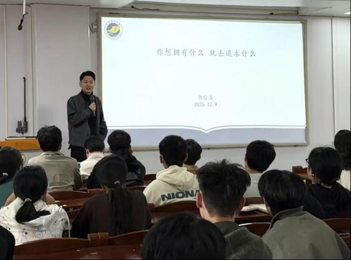 农康在致辞中,对林瑞柠、陈镕浩两位优秀校友的返校分享表示衷心感谢,并对他们在各自领域取得的卓越成就致以高度赞赏。他寄语在校生,既要以校友为榜样,扎实掌握专业理论知识,筑牢学术根基;也要主动探索行业前沿,在实践中提升创新能力,明确成长方向,不负韶华与期望。